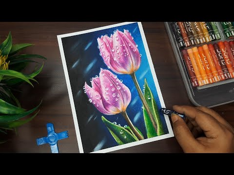 Oil pastel painting tulip flowers 🌷 How to draw pink tulips | Waterdrops drawing | Canvas Art