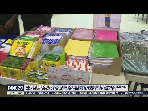 Autism R.E.C. holding backpack and school supply giveaway